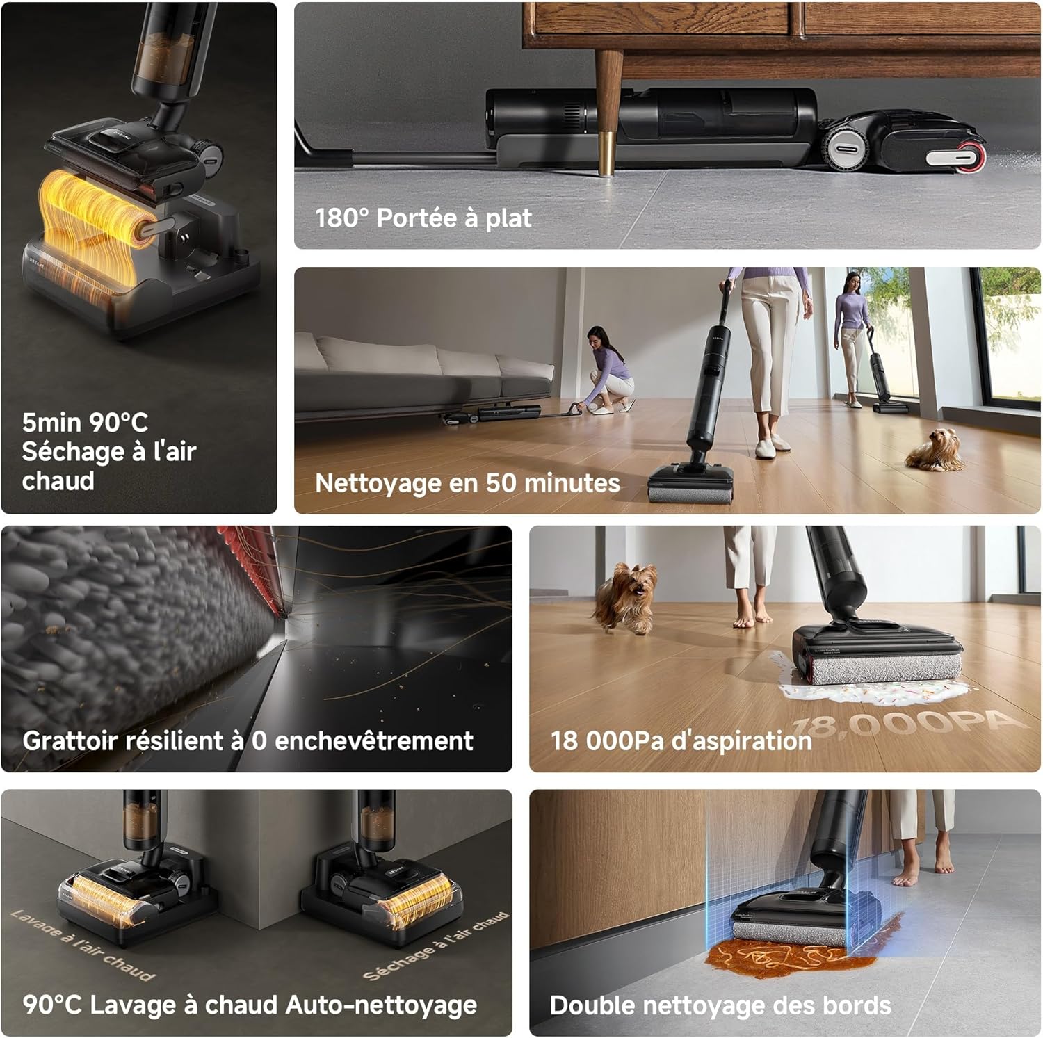 Son aspiration de 18 000 Pa lui permet d'éliminer les éclaboussures et la saleté, tandis que la brosse à deux bords assure un nettoyage facile le long des plinthes.