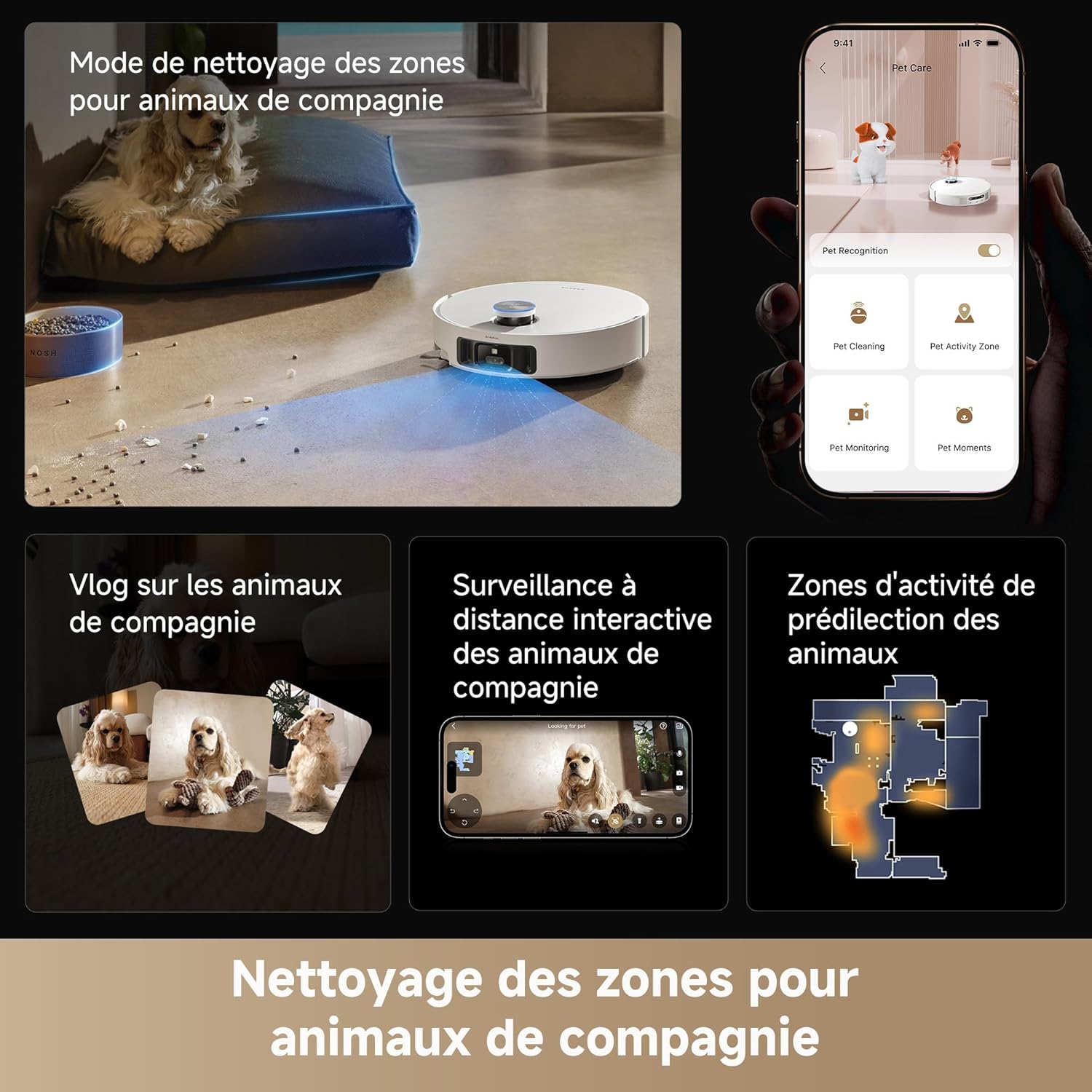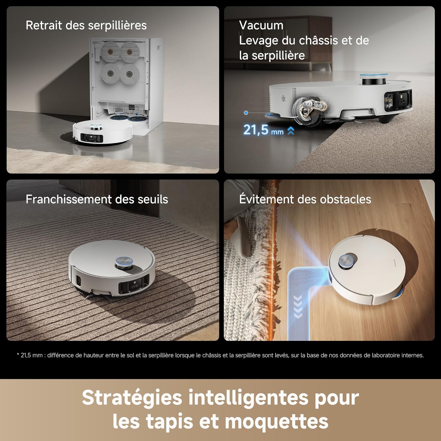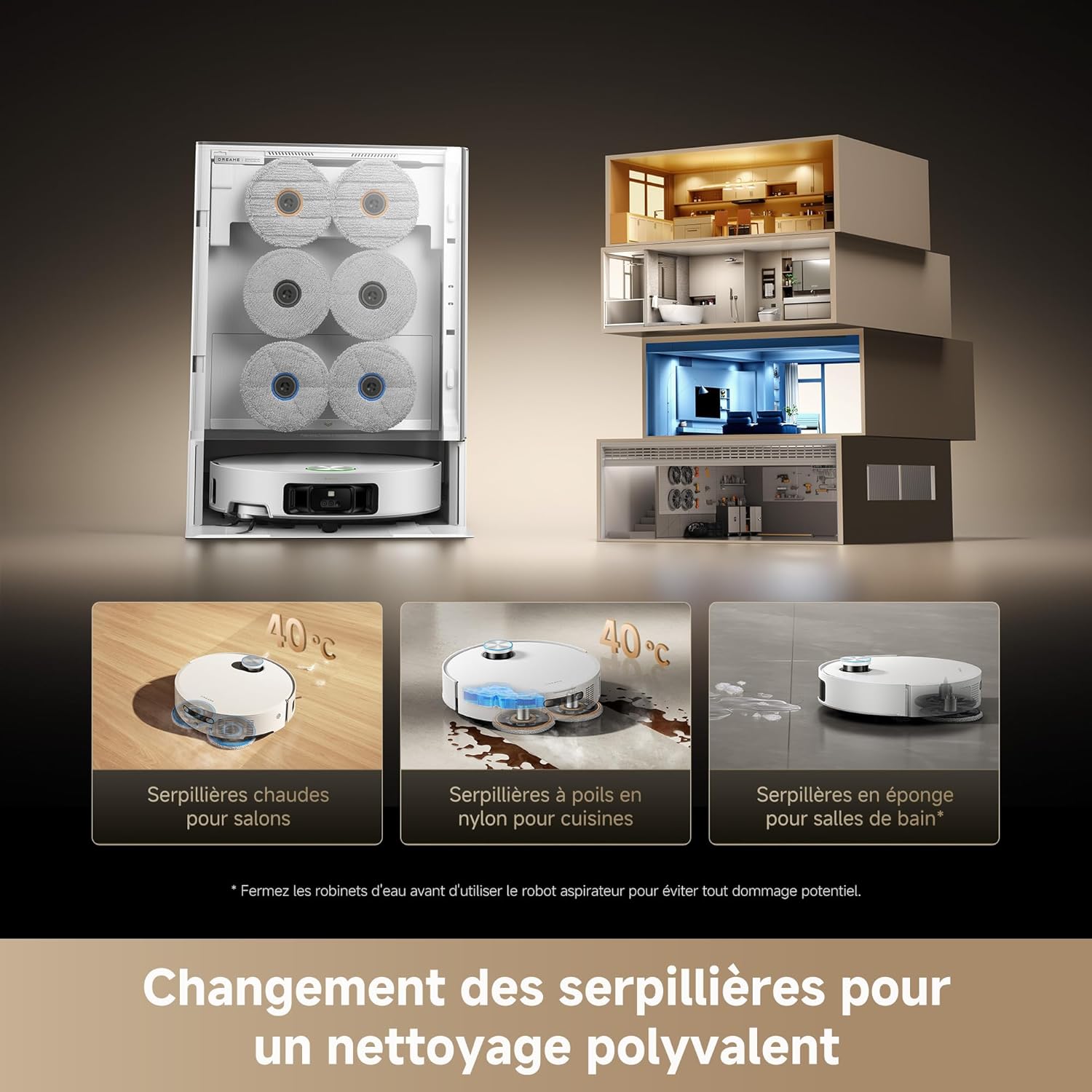 Son système de station tout-en-un vide la poussière, remplit le réservoir d’eau et nettoie les serpillières automatiquement — vous n’avez plus rien à faire.